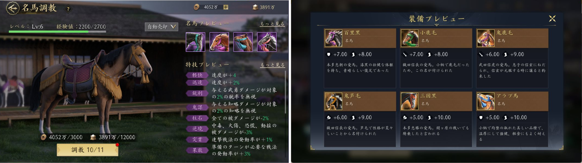 武将に名馬を装備することで、武将の能力増加や特技の効果を得られます。