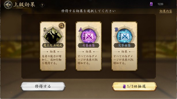 初級効果は銅銭、上級効果は「効果書」を消費して効果を抽選し、修得できます。再抽選も可能です。