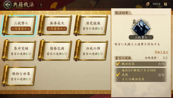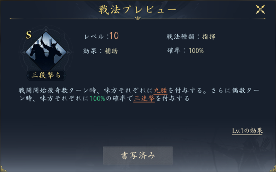 獲得した典籍戦法は、伝授戦法と同じく全ての武将が習得可能となります。