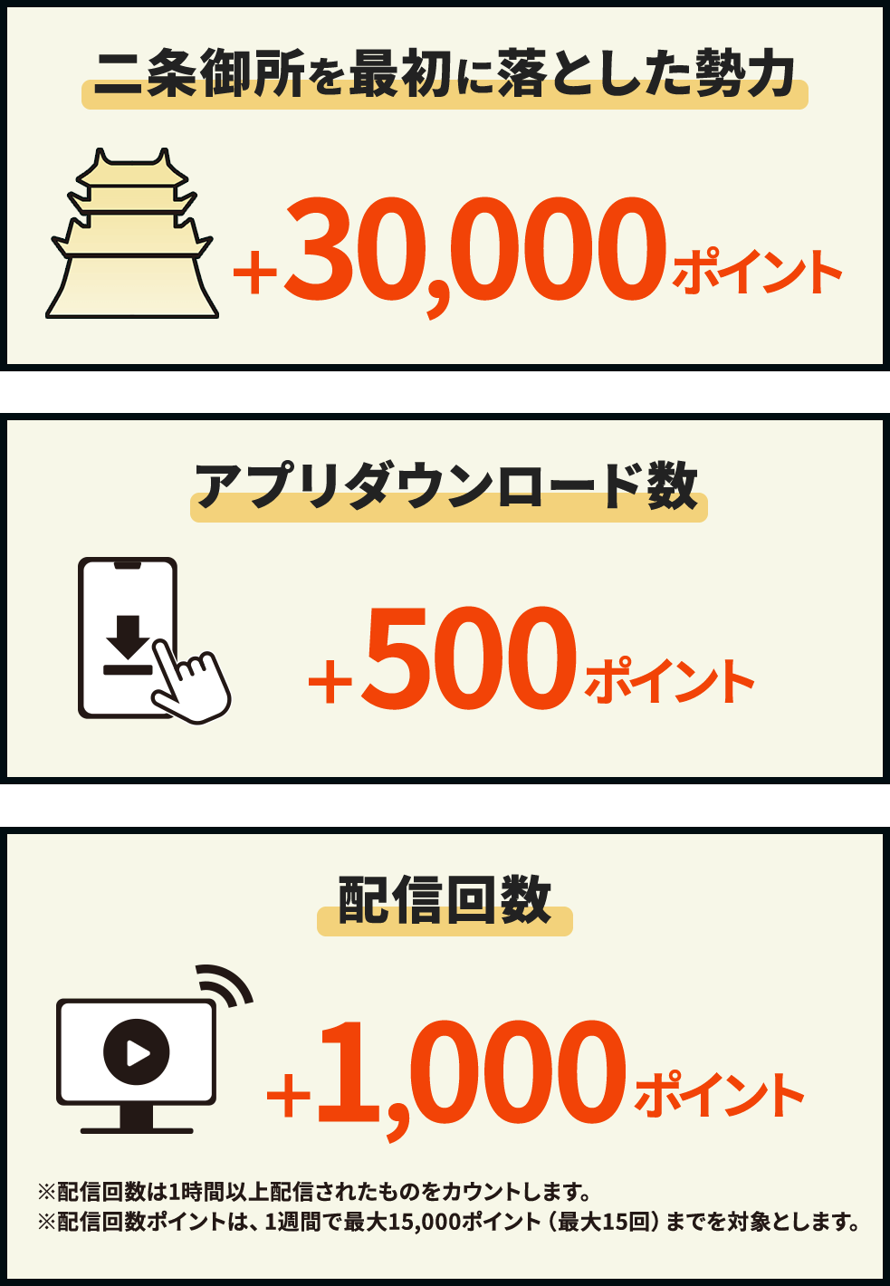 配信者対抗天下統一戦 では、以下の3つの項目でポイントを獲得できます。これらのポイントを合算し、最終的な総合ポイントでランキングが決定します。